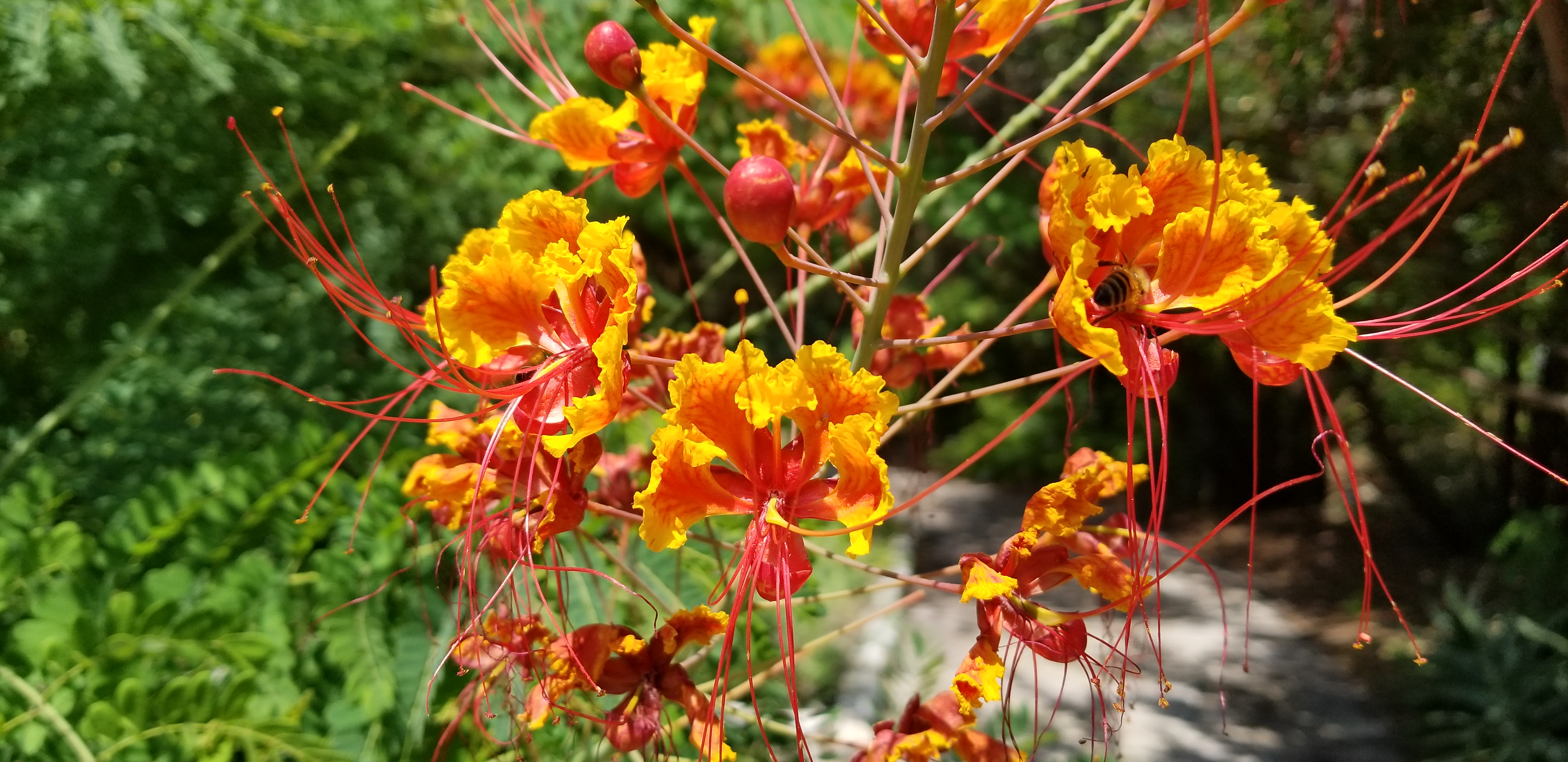 Caesalpinia pulcherrima is a species of flowering plant in the pea family, Fabaceae, native to the tropics and subtropics of the Americas. Pride of Barbados is an evergreen shrub or small tree in frost free climates, a deciduous shrub in zone 9, and a returning perennial in zone 8. In the tropics it gets 15-20′ tall and its ungainly, wide spreading branches can cover about the same width.