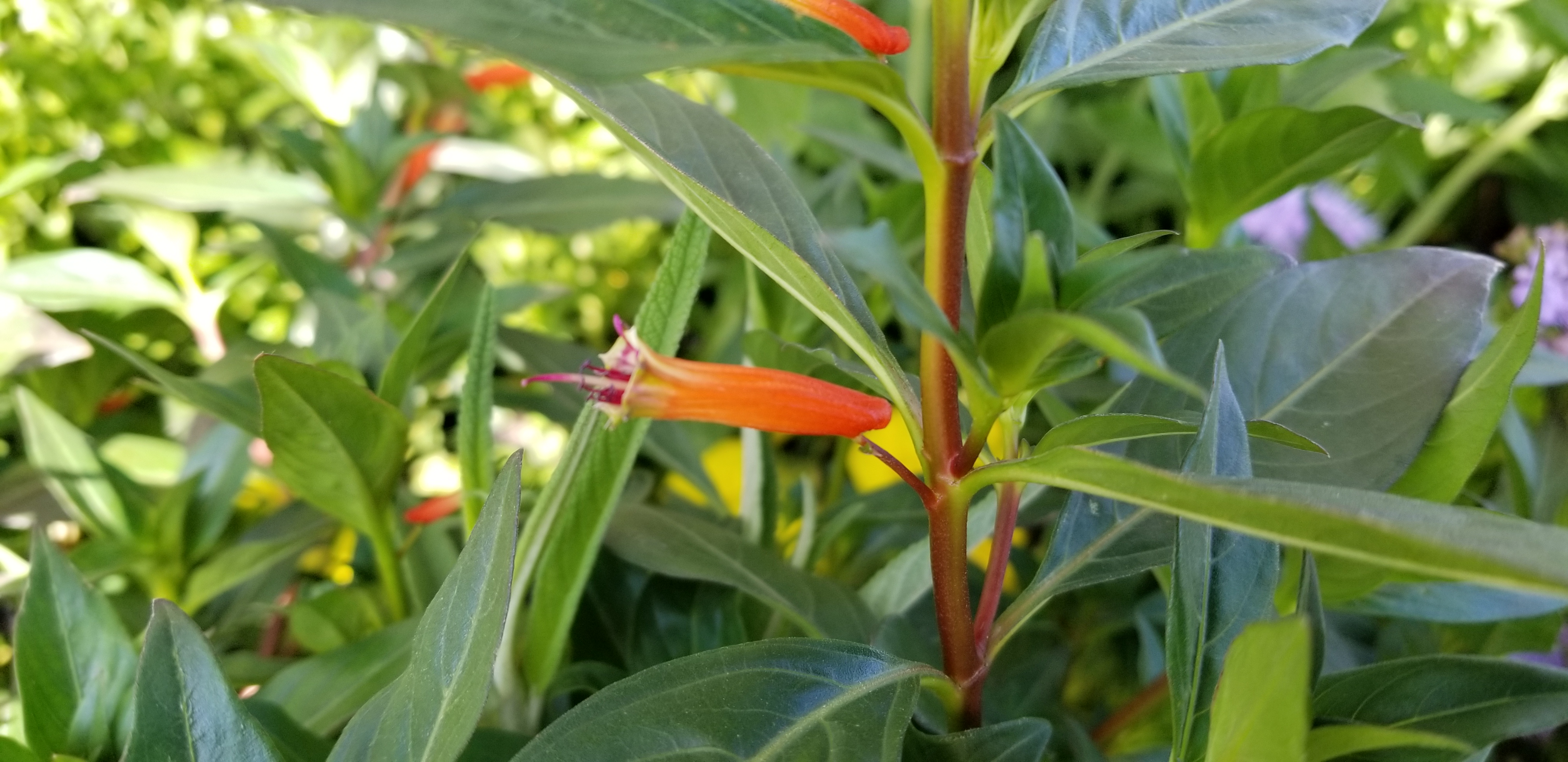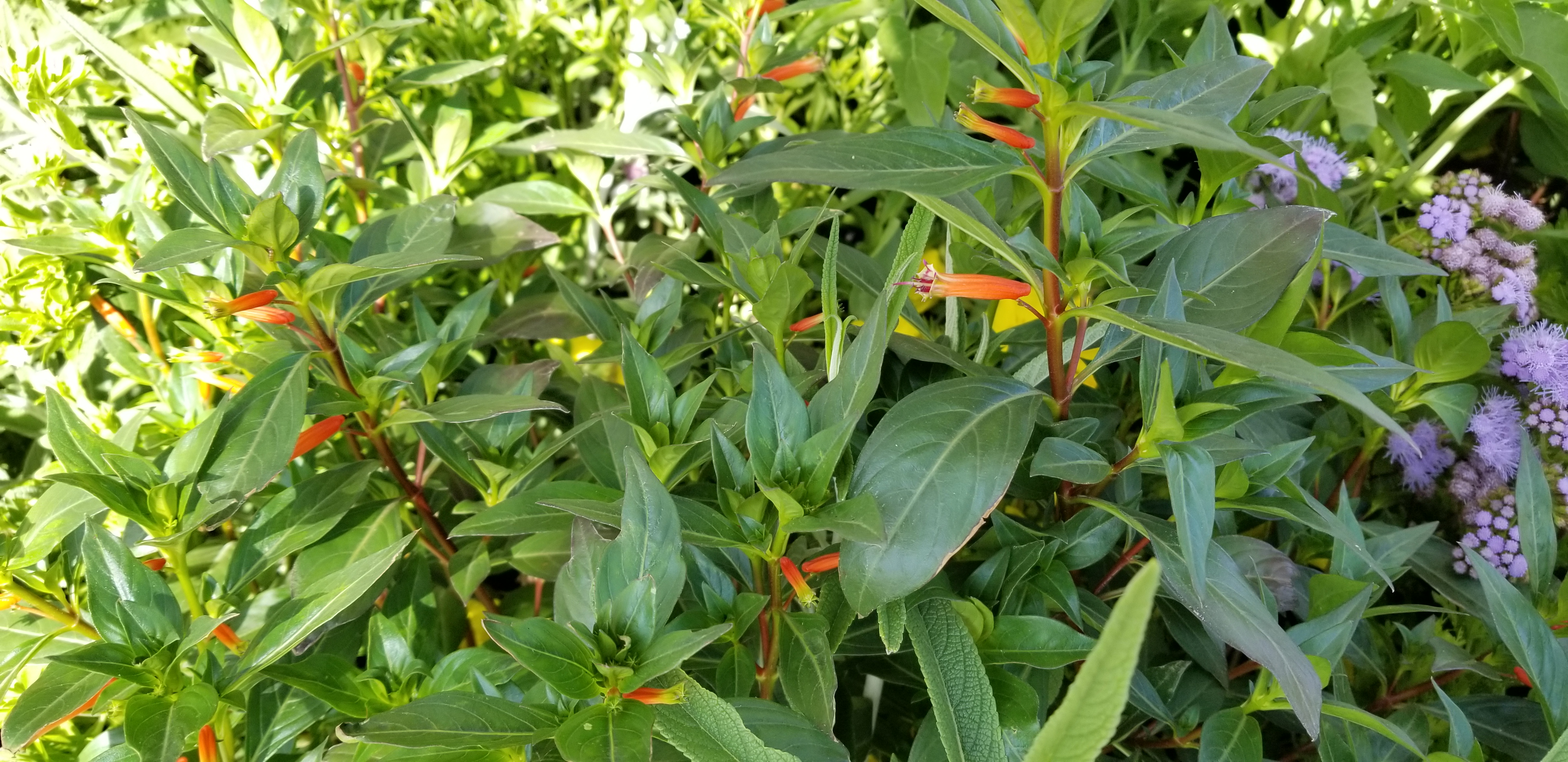 Mexican firebush, also called hummingbird plant, is a tropical shrub native in tropical climates around the Gulf of Mexico, Mexico, south Florida, parts of South and Central America and some Caribbean Islands. It likes full sun and the leaves will turn red with direct sunlight. A perennial in zones 8 – 11, it will come back from the roots every year. It also attracts pollinators.